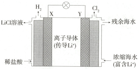 (2)①据图可知,$ H^+$在电极X上转化为$ H_2$,发生还原反应,则X为正极;Y为负极,$ Cl^-$在负极发生氧化反应生成$ Cl_2$,电极反应式为$2 Cl^--2 e^-\longrightarrow Cl_2\uparrow$。②由Y极反应式可知,生成1mol$ Cl_2$时,转移2mol电子,则有2mol$ Li^+$移向正极,即移向X极。