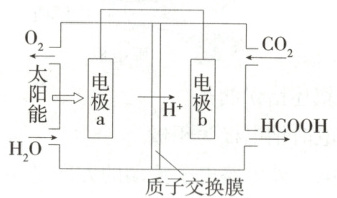 (1)图示为原电池装置,$ CO_2$在电极b附近转化为$ HCOOH$,发生还原反应,即电极b作正极,电极反应式为$ CO_2+2 e^-+2 H^+\longrightarrow HCOOH$。