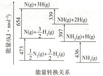 解析根据题图,知1/2molN₂(g)和3/2molH₂(g)断键吸收的能量为473kJ+654kJ=1127kJ,形成1molNH₃(g)放出的能量为339kJ+397kJ+436kJ=1172kJ,则ΔH=(1127−1172)kJ·mol⁻¹=−45kJ·mol⁻¹。