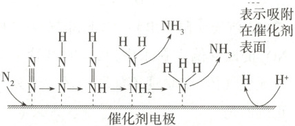 1.C $ H^+$转化为$ H$原子得到电子,发生还原反应,A 错误;由题图可知反应过程中没有产生$ N$原子,B 错误;在反应过程中$ N_2 H_4$可能脱离催化剂表面,因此可能生成$ NH_3$和$ N_2 H_4$两种产物,C 正确;与传统工业合成氨法比较,电化学固氮法不需要高温、高压条件,条件比较温和,具有研究价值,D 错误。