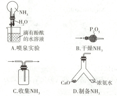 2.B NH₃极易溶于水,可进行喷泉实验,A正确;P₂O₅为酸性氧化物,会与碱性气体NH₃反应,不能用于干燥NH₃,B错误;NH₃的密度小于空气,可用向上排空气法收集NH₃,C正确;CaO与浓氨水中的水发生反应放热,使NH₃·H₂O分解产生大量NH₃,可制备NH₃,D正确。