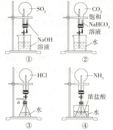 3.B SO₂与氢氧化钠溶液反应,因此可以引发喷泉,A不符合题意;二氧化碳在饱和碳酸氢钠溶液中溶解度很小,烧瓶内外压强差不大,因此不能引发喷泉,B符合题意;从a处不断鼓入空气,会将水压入烧瓶中,且HCl易溶于水,能形成喷泉,C不符合题意;水槽中加入生石灰,生石灰与水反应放热,浓盐酸挥发,锥形瓶中压强增大,浓盐酸进入烧瓶与氨气反应,能形成喷泉,D不符合题意。