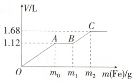 向$ 200\ mL $稀硫酸与稀硝酸的混合溶液中逐渐加入铁粉,已知加入铁粉的质量与产生气体的体积(标准状况)之间的关系如图所示,则下列说法不正确的是 (
