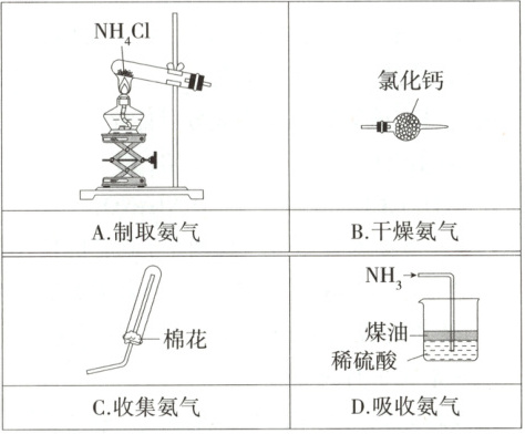 6.C $NH_4Cl$在试管底部受热分解生成$NH_3$和HCl,在试管口遇冷又生成$NH_4Cl$固体,A错误;$NH_3$能与$CaCl_2$反应生成$CaCl_2·8NH_3$,故不能用$CaCl_2$干燥$NH_3$,B错误;$NH_3$的密度比空气小,可用向下排空气法收集,为防止与空气发生对流,在试管口通常放一团疏松的棉花,C正确;$NH_3$通入稀硫酸中会发生倒吸,该装置中煤油起不到防倒吸作用,D错误。