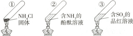 4.B 氯化铵受热分解生成$NH_3$和HCl,遇冷$NH_3$和HCl又化合生成氯化铵,则加热①时,上部汇集了$NH_4Cl$固体,此过程中发生了化学变化,A错误;加热②时,溶液红色变浅,可证明氨气的溶解度随温度的升高而减小,B正确;二氧化硫与品红化合生成无色物质,无色物质受热后又发生分解,所以加热③时,溶液变为红色,冷却后又褪色,体现$SO_2$的漂白性,C错误;可逆反应的反应条件相同,②中氨气与水的反应为可逆反应,①中反应不是可逆反应,D错误。