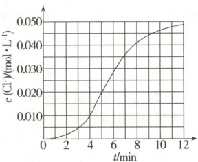 15. 某化学小组测定酸性条件下KClO₃溶液与NaHSO₃溶液反应的化学反应速率,所用的试剂为10 mL 0.1 mol·L⁻¹ KClO₃溶液和10 mL 0.3 mol·L⁻¹ NaHSO₃溶液,c(Cl⁻)随时间变化的曲线如图所示。下列说法错误的是 (