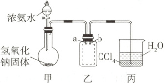 2.B 氢氧化钠固体溶于水放出大量热,$NH_3·H_2O$不稳定,受热分解产生$NH_3$,A正确;氨气的密度比空气小,宜用向下排空气法收集,因此装置乙中的集气瓶内a导管短、b导管长,B错误;氨气极易溶于水,难溶于$CCl_4$,装置丙中的$CCl_4$可防止倒吸,C正确;甲中固体可以换成碱石灰或氧化钙,D正确。