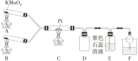 (4)$NH_3$催化氧化生成NO,NO与$O_2$反应生成红棕色气体$NO_2$,$NO_2$溶于水生成$HNO_3$,使紫色石蕊溶液变红;熄灭A装置中的酒精灯,继续加热B装置中的酒精灯,继续产生$NH_3$,过量$NH_3$使装置D中红棕色慢慢褪去,$NH_3$进入装置E和$HNO_3$反应生成硝酸铵,过量$NH_3$使溶液显碱性,溶液由红色变为蓝色。