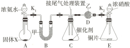 1.(2024 山东淄博期中)$\mathrm{NH_3}$可用作脱硝剂。某科研小组为了探究$\mathrm{NO_2}$能否被$\mathrm{NH_3}$还原,设计的装置如图所示(夹持、加热装置已略去,$\mathrm{K_1}$、$\mathrm{K_2}$为止水夹),下列说法不正确的是 (