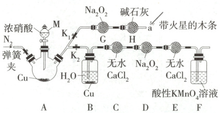 (2)①关闭 K₂和弹簧夹,打开 K₁和 A 中仪器 M 的旋塞,若观点二正确,则产生的 NO₂与 Na₂O₂反应生成 O₂,所以观察到的现象为红棕色气体迅速消失,带火星的木条复燃。②产生的 NO₂中混有水蒸气和硝酸,故增加装置的作用是除去 NO₂中混有的水蒸气和硝酸。