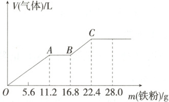 5. (2024 湖南常德一中月考)向${200\ \mathrm{mL}}$稀硫酸和稀硝酸的混合溶液中逐渐加入铁粉,产生气体的量随铁粉质量的变化如图所示(已知硝酸只被还原为$NO$)。下列分析错误的是 (