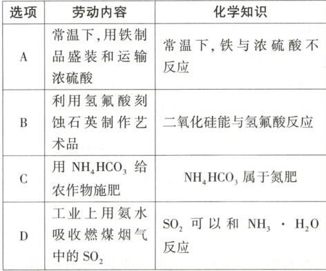 1. (2024 广东佛山期中)下列劳动内容所涉及的化学知识错误的是 (