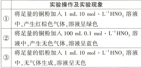2.A 实验①产生红棕色气体,溶液呈绿色,发生反应Cu+4HNO₃(浓)=Cu(NO₃)₂+2NO₂↑+2H₂O,实验②产生无色气体,溶液呈蓝色,发生反应3Cu+8HNO₃(稀)=3Cu(NO₃)₂+2NO↑+4H₂O,实验①与实验②中硝酸的物质的量相等,故实验①中消耗的铜粉质量小于实验②,A正确;实验②中生成一氧化氮气体,一氧化氮易与氧气反应,故不能用排空气法收集,B错误;实验③无气体生成,是因为常温下,铝遇浓硝酸钝化,C错误;根据实验①②可得金属与硝酸反应的还原产物与硝酸的浓度有关,由实验①③无法得出金属与硝酸反应的还原产物与金属活泼性有关,D错误。