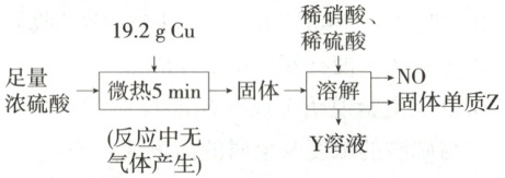 4.C Cu与浓硫酸发生反应,生成的白色固体为CuSO₄,A正确;n(Cu)=$\frac{19.2g}{64g·mol⁻¹}$ = 0.3mol,设反应生成的Cu₂S为xmol,则CuSO₄为(0.3 - 2x)mol,由得失电子守恒得2x + 2×(0.3 - 2x)=8x,解得x = 0.06,即Cu₂S为0.06mol,CuSO₄为0.18mol,故微热5min待Cu反应结束后,转移电子的物质的量为0.06mol×2 + 0.18mol×2 = 0.48mol,B正确;结合图示可知0.06molCu₂S与HNO₃、H₂SO₄发生氧化还原反应生成CuSO₄、S、NO,由得失电子守恒可知生成的NO在标准状况下的体积为$\frac{0.06mol×4}{3}$×22.4L·mol⁻¹ = 1.792L,C错误;由C项分析可知Z是硫单质,D正确。