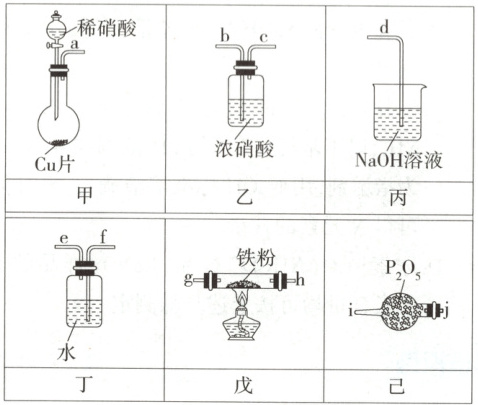 4.D 题给实验用NO与铁粉反应生成N₂和FeO,甲装置制备NO气体,制备的NO气体中混有水蒸气、硝酸蒸气和NO₂,水蒸气用P₂O₅除去,NO₂和硝酸蒸气用水除去,NO有毒,需要进行尾气处理,根据信息,先通过浓硝酸将NO氧化为NO₂,再通入NaOH溶液中除去。接口连接顺序是a→f→e→j→i→h→g(或g→h)→b→c→d,A正确;NO与铁粉反应生成氮气和FeO,其化学方程式为2NO+2Fe$\xlongequal{△}$2FeO+N₂,B正确;装置丁的作用是除去挥发出来的硝酸和产生的NO₂,C正确;浓硝酸不具有吸水性,不能做干燥剂,根据信息可知,浓硝酸的作用是将NO氧化成NO₂,便于NaOH溶液吸收,防止污染环境,D错误。