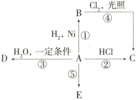 (2)结合物质变化可分别写出①、④对应的化学方程式为$CH₂=CH₂+H₂\stackrel{Ni}{\underset{\triangle}{\rightarrow }}CH₃CH₃、$$CH₃CH₃+Cl₂\stackrel{光照}{\rightarrow}CH₃CH₂Cl+HCl,$分别属于加成反应和取代反应。