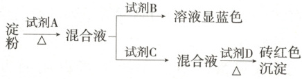 1. (2025 河南南阳期末) 将淀粉溶于适量水进行水解实验并测定淀粉的水解情况,其程序如图所示,A、B、C、D 都是实验室常用的无机试剂。则 A、B、C、D 分别是 (