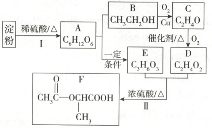 解析 淀粉在酸性条件下水解生成的A为葡萄糖,结合图示转化可知C为CH₃CHO,D为CH₃COOH,再由反应Ⅱ的产物可确定E为CH₃CHCOOH。