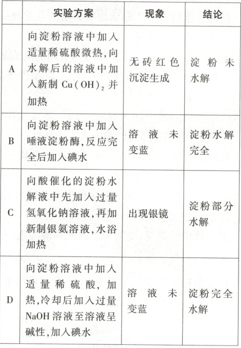 1.A 淀粉在稀硫酸作用下发生水解,向水解液中加入碘水,溶液呈蓝色,说明淀粉未完全水解;向水解液中加入足量NaOH溶液,使水解液呈碱性,再加入新制Cu(OH)₂,加热,产生砖红色沉淀,可证明水解产物中含葡萄糖。结合上述分析可知A、B、C、D分别是稀硫酸、碘水、NaOH溶液、新制Cu(OH)₂。