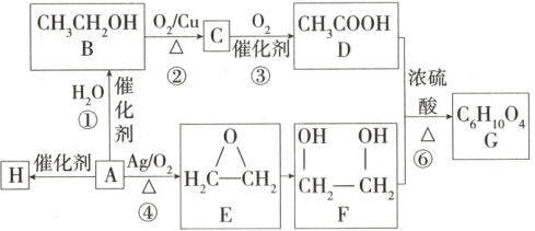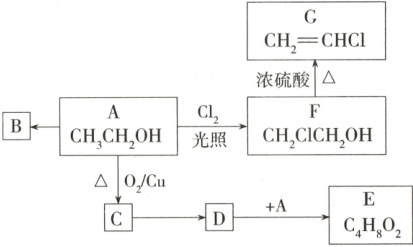 解析 有机物 B 是相对分子质量为 28 的气态烃,能使溴水褪色,B 为 CH₂=CH₂;A 为 CH₃CH₂OH,A 发生催化氧化反应生成 C,C 为 CH₃CHO;A、D 发生酯化反应生成 E,D 为 CH₃COOH,E 为 CH₃COOCH₂CH₃;A 与 Cl₂ 发生取代反应生成 F,F 发生消去反应生成 G。