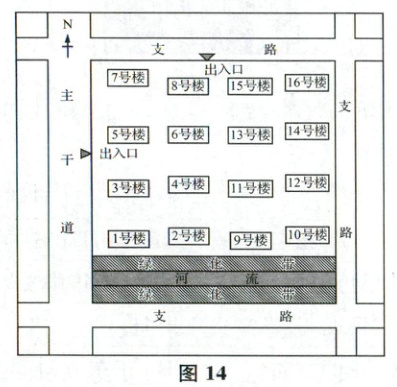 (2024连云港月考)2022年11月,连云港某楼盘(34°N,119°E)开盘销售已封顶的1~4、9~12号楼。这8幢楼均为25层,层高3 m,南北楼间距为50 m。图14为“该楼盘平面示意图”。据此完成9~10题。