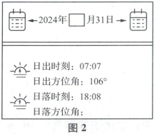 (2025 南通期中)方位角是从某点的指北方向线起,依顺时针方向到目标方向线之间的水平夹角。我国某中学地理兴趣小组为测量当地日出、日落方位角,开展地理实践活动,并进行记录。图 2 示意该小组学生记录的相关信息(图中时间为北京时间)。据此完成 1~3 题。