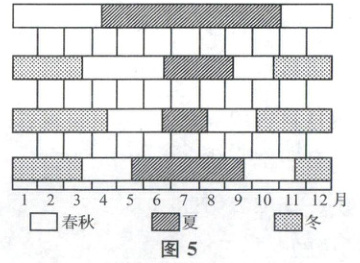 图 5 为“我国北京、广州、武汉、哈尔滨四个城市的季节分配示意图”。读图完成 7~8 题。