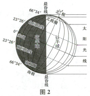 材料二 现如今许多智能手机都有晨昏线功能,该功能让整个地球白天和黑夜的分界一目了然,各个地区的昼夜交替变得无比直观。更有趣的是,盯着屏幕看,你会发现晨昏线随着时间的流逝缓缓移动,看着世界上的某些角落暗了,某些角落又即将迎来曙光,时间流逝的感觉变得无比鲜活。图2为“昼半球和夜半球图”。