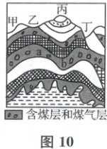 (2)结合材料二、三探究:①为什么“背斜找油,向斜找水”?②隧道工程为什么尽可能选择背斜部位?水库等大型工程建设为何避开断层带?③图10甲、乙、丙、丁四点中有泉水出露的可能是哪一点?在a、b两处采煤,易发生瓦斯爆炸的是哪一处?易发生透水事故的是哪一处?