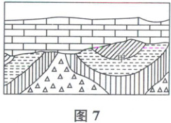 从形态上看,背斜一般是岩层向上拱起,地形的原始形态为山岭。向斜一般岩层向下弯曲,地形的原始形态应为谷地。但是我们不能单凭地表形态来判断背斜和向斜。不能到了山区,看到山岭就高喊:“啊,背斜!”看到谷地就高喊:“啊,向斜!”那会闹笑话的。判断背斜、向斜最可靠的依据是岩层的新老关系。图7和图8是两幅“地质构造示意图”。