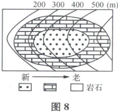 ②图7中未交代岩层新老关系,此时要根据岩层上拱还是下弯判断背斜还是向斜。甲处岩层向下弯曲为向斜构造。③图7所示地区首先经过水平挤压形成褶皱,然后地壳上升接受侵蚀,接着地壳下沉接受沉积形成上覆岩层。④该地岩层从中心向两翼由新到老,为向斜。