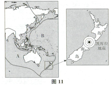 (2024徐州期初)据英国《卫报》报道,2016年发生的7.8级凯库拉大地震,不仅使新西兰一些地区地表上升了8m,而且把新西兰的南岛、北岛拉近了5m,研究人员称,南岛向北移动的趋势还将持续数年。读图完成1~2题。