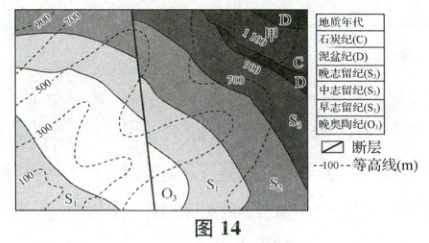 8. C 断层形成晚于被断裂的岩层,断层切断了O₃、S₁、S₂、S₃地层,因此可以判断断层形成于这些地层形成之后,C正确,B、D错误;无法判断断层是否切断C地层,因此无法判断断层与C地层的先后形成顺序,A错误。故选C。