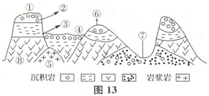 6. B ⑥处顶层岩层向下弯曲,为向斜地质构造,由于向斜槽部受挤压,岩层坚硬,不易被侵蚀,残留成山,所以图中⑥处山地为向斜成山,B正确,A、C、D错误。故选B。