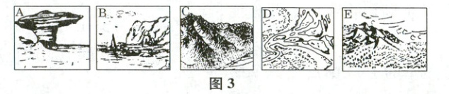 材料三 某大学地理系的学生们,利用假期时间到全国各地进行考察活动,图 3 是他们绘制的地貌景观素描图。