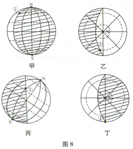 (2024苏州月考)图8为“全球不同日期太阳光照示意图”(阴影部分表示夜晚)。读图完成7~8题。