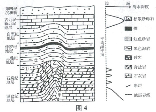 (2024 盐城期中)图4为“某地地质剖面和海水深度变化示意图”。读图完成1~2题。