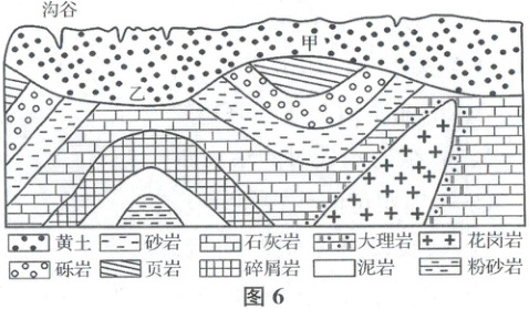 5 A砂岩、石灰岩均为沉积岩,三大类岩石中只有沉积岩中可能存在化石,A正确;大理岩是石灰岩在高温高压环境下变质形成的,岩浆侵入可以提供高温高压的变质环境,B错误;风力作用主要分布在干旱半干旱地区,流水作用主要分布在湿润半湿润地区,黄土高原地区降水较为集中,地势起伏较大,水土流失严重,其沟谷主要是受流水侵蚀作用形成的,C错误;甲处岩层向下弯曲,为向斜构造,乙处岩层向上弯曲,为背斜构造,但是两地的地表起伏均较小,D错误。故选A。