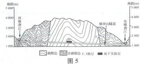 (2025 扬州期中)2023年12月,世界最深、最大的极深地下实验室——锦屏地下实验室正式投入运行,为我国开展暗物质探测研究奠定了良好基础。图5为“锦屏山地质构造示意图”,甲处为地下实验室位置。据此完成3~4题。