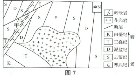 (2025 南京六校联合体月考)地质构造线是指区域性构造在地面上的延伸线(如岩层层面与水平面交线的延伸方向),图7为“某区域地质平面图”,该地质区域形成初期以沉积作用为主,图中辉绿岩为岩浆岩体。据此完成7~8题。