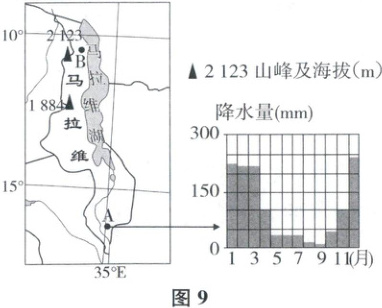 茶树为灌木或小乔木,喜欢温暖湿润的气候,喜光耐阴,生长最适温度为 20~25 ℃。茶叶四季可采,但只有在特定时间段采摘的茶叶才最为珍贵,图 9 示意马拉维的地理位置和该国 A 地多年每月平均降水量。据此完成 7~8 题。