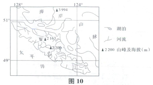 (2025 苏州期中)在年降水量高达 2 000 mm 以上的温带地区,有一种特殊的植被类型——温带雨林。图 10 中的 W 岛西部是世界温带雨林主要分布区之一。据此完成 9~10 题。
