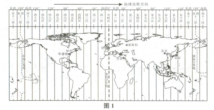 材料一 由于地球自西向东自转,在同纬度地区,相对位置偏东的地点先看到日出,这种因经度不同而出现的不同时刻,称为地方时。经度每隔 15°,地方时相差 1 小时,经度每相差 1°,地方时相差 4 分钟。例如,当北京时间为 12 时时,北京天安门广场旗杆的影子并未朝正北方向,而是朝向西北。