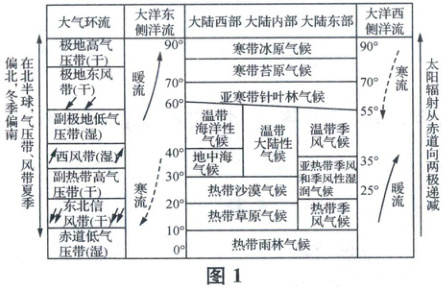 材料二 图1是“世界主要气候类型的分布、成因示意图(以北半球为例)”。