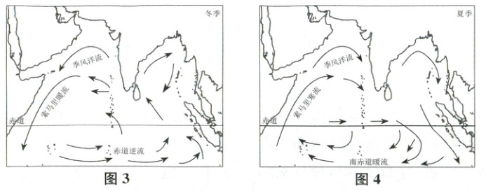 (5)该海区冬季盛行东北季风,季风洋流向西流,环流系统由季风洋流、索马里暖流和赤道逆流组成,呈逆时针方向流动(见图3)。该海区夏季盛行西南季风,季风洋流向东流,此时索马里暖流和赤道逆流消失,索马里沿岸受上升流的影响,形成与冬季流向相反的索马里寒流,整个环流系统由季风洋流、索马里寒流和南赤道暖流组成,呈顺时针方向流动(见图4)。