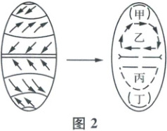 (4) 结合材料二探究:①结合图 2 中左图所示风带,在右图中画上相应箭头,完成“世界洋流模式图”。②总结图中甲、乙、丙三环流的世界分布规律。③丁环流在南半球实际大洋中不明显,为什么?