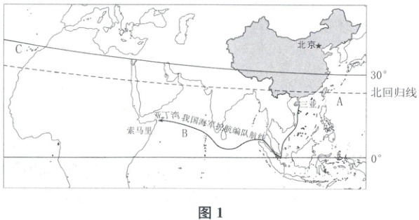 材料一 2024 年 12 月 15 日,中国海军包头舰、红河舰、高邮湖舰组成第 47 批护航编队从舟山某军港解缆起航,赴亚丁湾、索马里海域接替第 46 批护航编队执行护航任务。自 2008 年以来,我国已连续不间断地派出了 46 批编队赴亚丁湾、索马里海域执行护航任务,已为上万艘中外船舶实施了安全护航。图 1 为“我国海军某批护航编队出发航线图”。