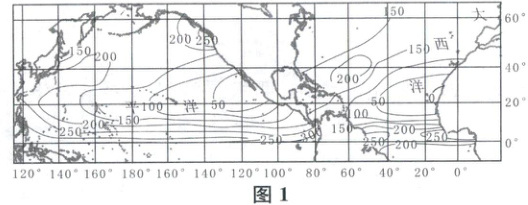材料二 图1为“海洋平均每日向大气输送的热量分布(单位:$×0.484 W/ m^2$)示意图”。