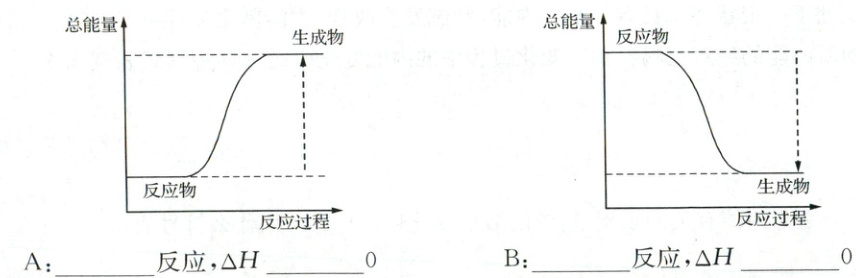 1 在化学反应过程中,当反应物和生成物具有相同温度时,吸收或释放的热称为化学反应的热效应,也称反应热。在恒压条件下,化学反应中吸收或释放的热为反应的焓变。焓变的单位常采用$ kJ/mol$。2 一个化学反应是吸收能量还是释放能量,取决于反应物总能量和生成物总能量之间的相对大小。若反应物的总能量小于生成物的总能量,则反应过程中吸收能量;若反应物的总能量大于生成物的总能量,则反应过程中释放能量。化学反应中的能量变化通常以热等形式表现出来。吸收热的反应称为吸热反应,其$\Delta H>0$;放出热的反应称为放热反应,其$\Delta H<0$。3 吸热 $>$ 放热 $<$ 4