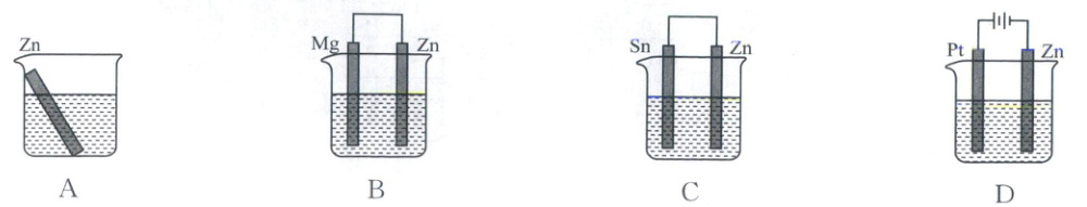 1. [鲁科版教材习题]四块相同的锌片分别放置在下列四个装置中,烧杯中均盛有 0.1 mol/L NaCl 溶液,则锌片腐蚀最快的是(